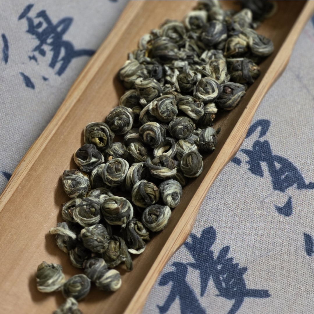 茉莉花龍珠は、香り高いジャスミンの花びらと茶葉を伝統的な製法で結びつけた特別なお茶です。ひと粒ひと粒が小さな花のように愛らしく、茶葉が開く瞬間、まるで花が咲くような美しさを楽しむことができます。ジャスミンの優雅な香りが広がり、穏やかな時間を演出する一杯です。心を癒すリフレッシュ効果もあり、特別なリラックスタイムにぴったりです。贈り物やご自身へのご褒美としてもオススメです。
