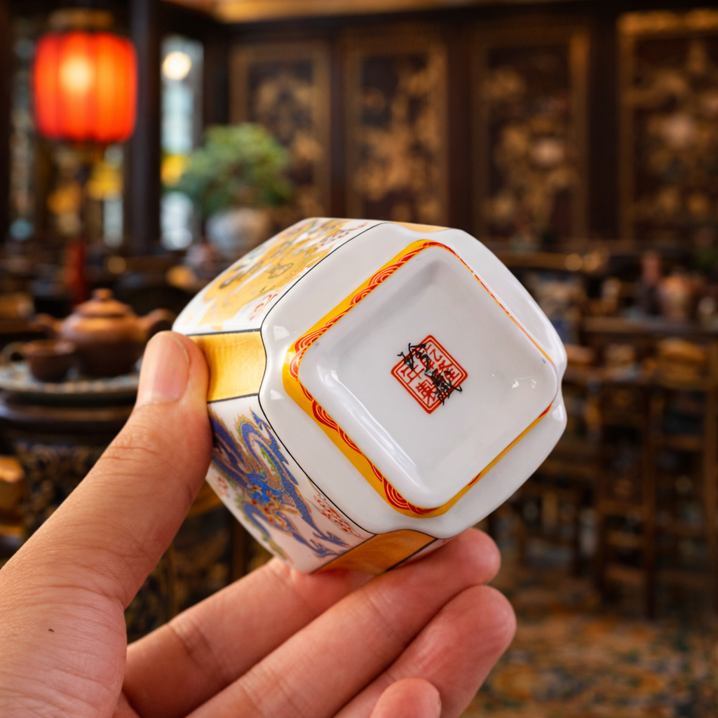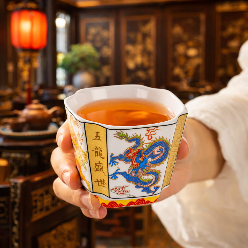 商品名:景徳鎮五龍杯(五龍盛世) 景徳鎮五龍杯は、中国の伝統的な技術を駆使して作られた美しい磁器の杯です。四匹の龍を杯の側面に、五匹目の龍を杯の底面に配し、五つの龍が描かれたこの杯は、力強さと美しさを兼ね備えており、特別なひとときを演出します。大きめのサイズで茶海がないシーンなど一人飲みにも最適。お茶の他にも日本酒やデザート、前菜等を楽しむための器としても最適で、心を豊かにするひとときをお楽しみいただけます。 この五龍杯は、細部にわたる職人技が光る逸品で、しっかりとした作りと華やかなデザインが特徴です。お湯を注ぐことで、その美しい絵柄が際立ち、温かみのあるひとときを提供します。自宅でのリラックスタイムや、おもてなしのシーンにもぜひご利用下さい ■原材料:磁器 ■原産国:中国(景徳鎮) ■内容量:1個 約100㎖